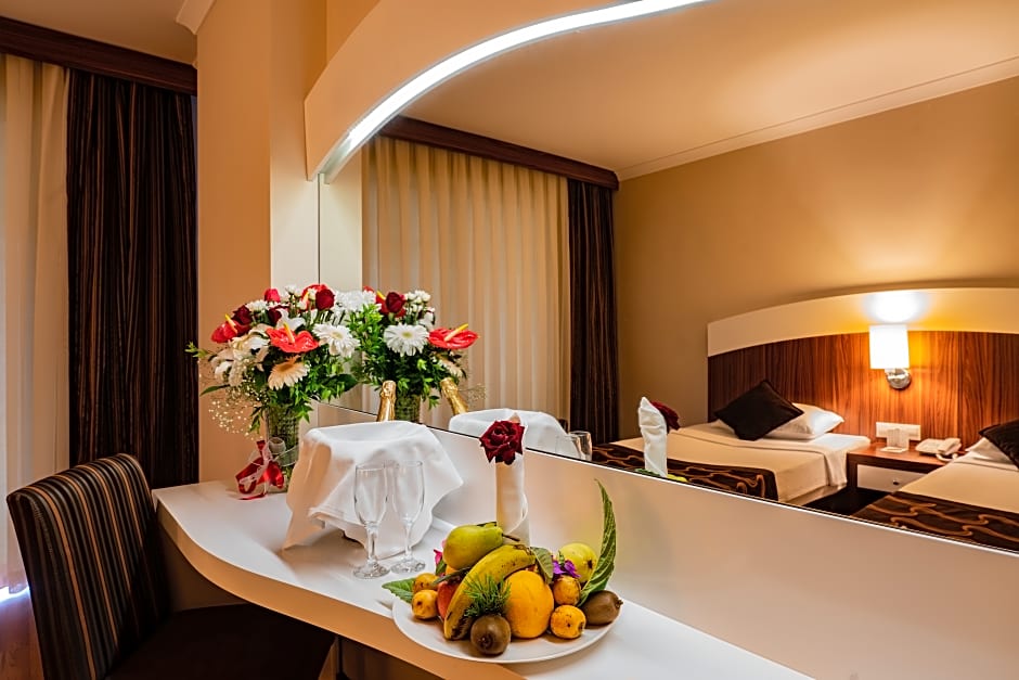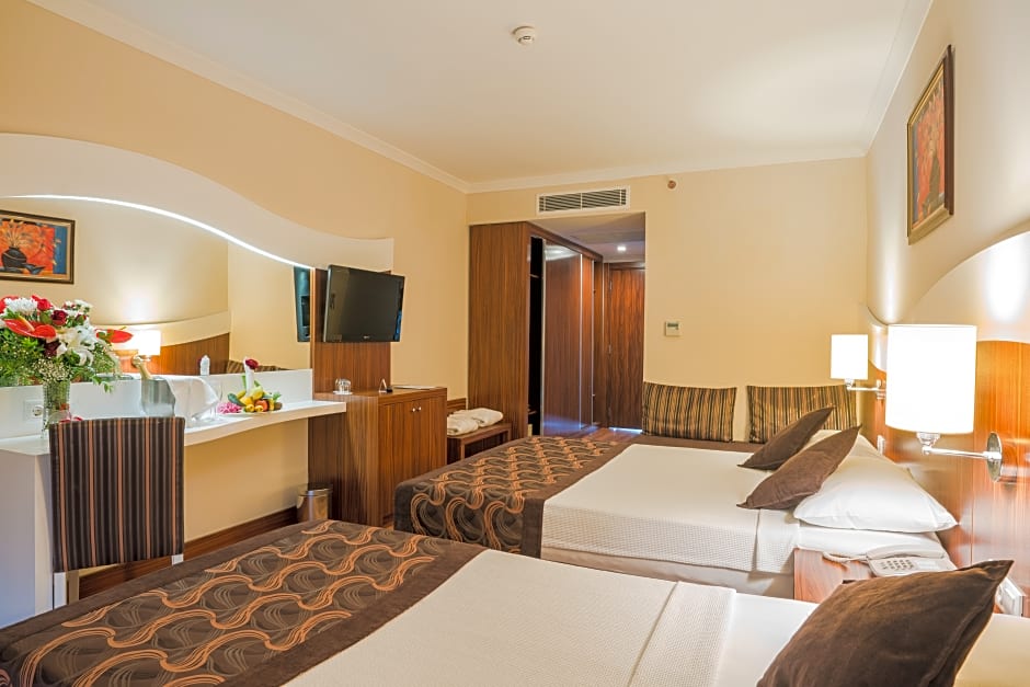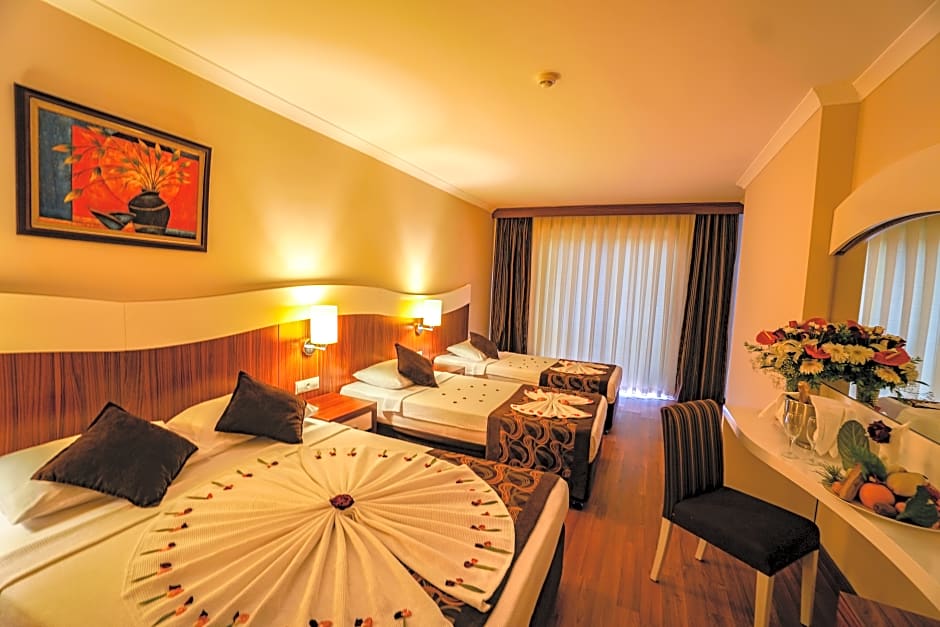 From the moment you arrive, you'll be greeted with a smile at the 24-hour front desk and be swept away by the resort’s lively atmosphere, featuring a water park with thrilling slides, a sparkling outdoor pool, and vibrant live performances. The family-friendly kids' club, free parking, and soundproof rooms ensure peace of mind and comfort, whether you’re traveling with little ones or seeking a peaceful retreat. For relaxation after a day of fun, indulge in complimentary Turkish baths, saunas, and a steam room, or treat yourself to spa services (extra charges) and massages.